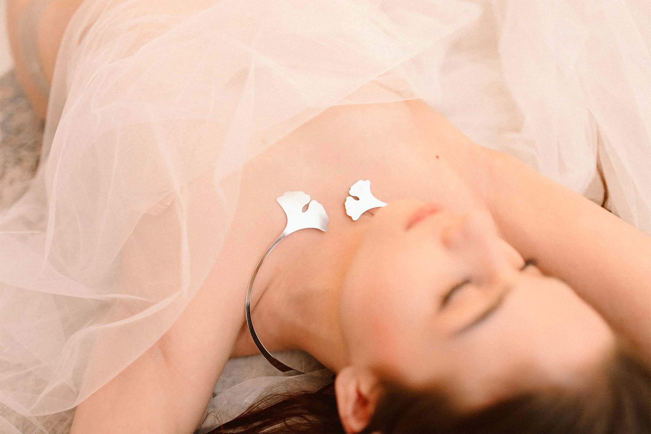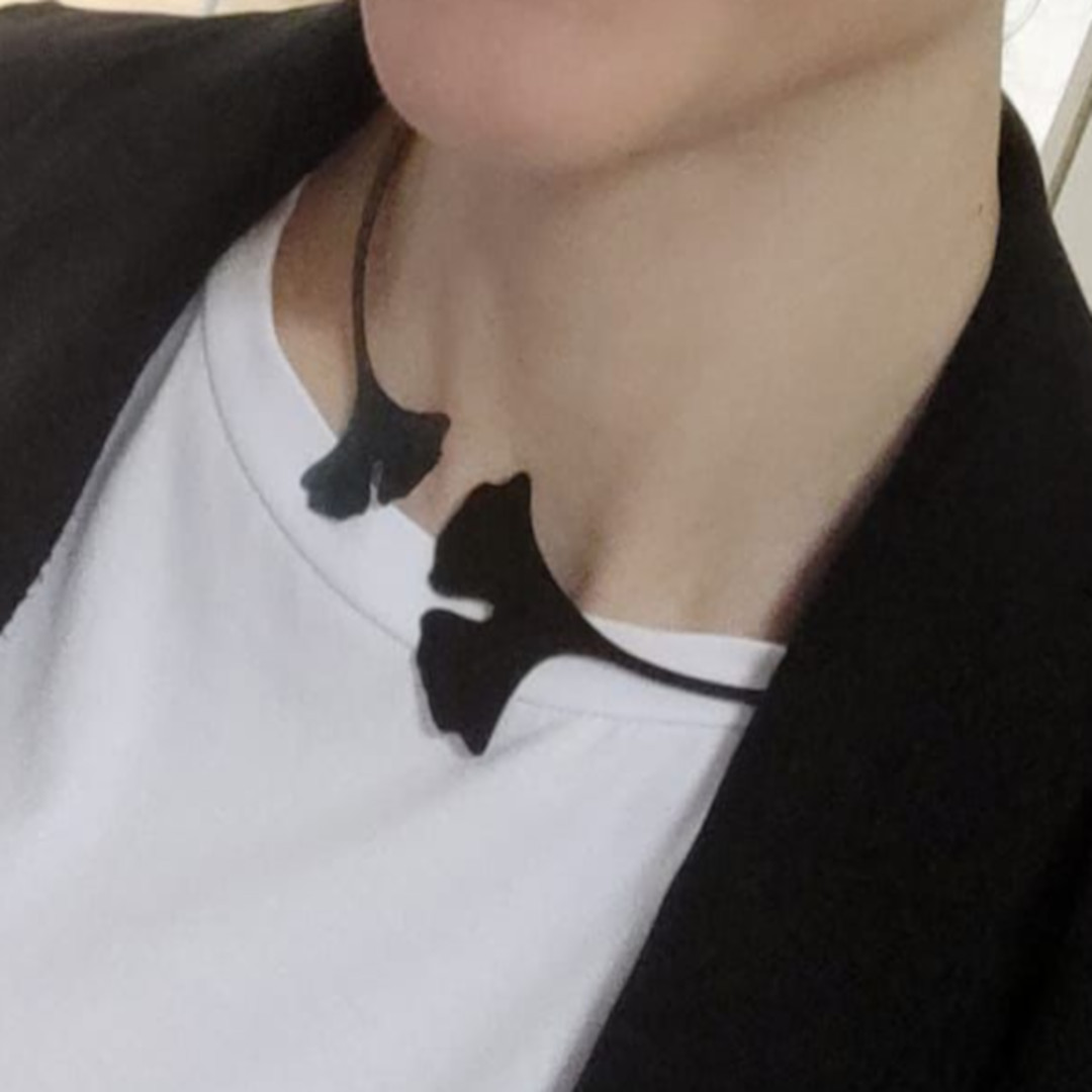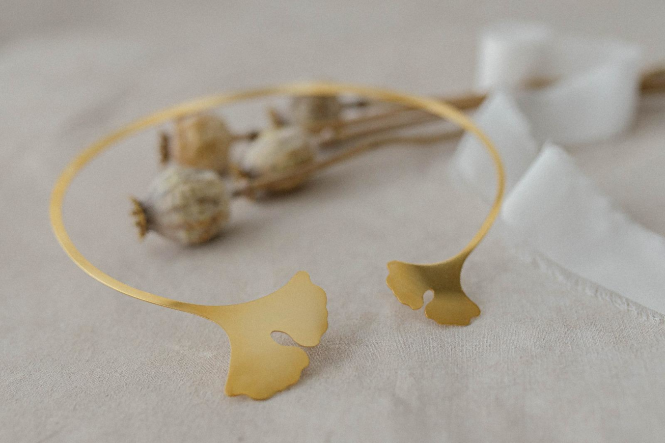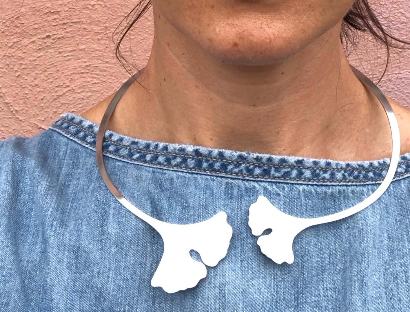 Sii poetica come una foglia di gingko caduta a terra. Questo collier celebra la caduta delle foglie come portatrice di nutrimento per i nuovi germogli. Non criticare una tua caduta: ringraziala